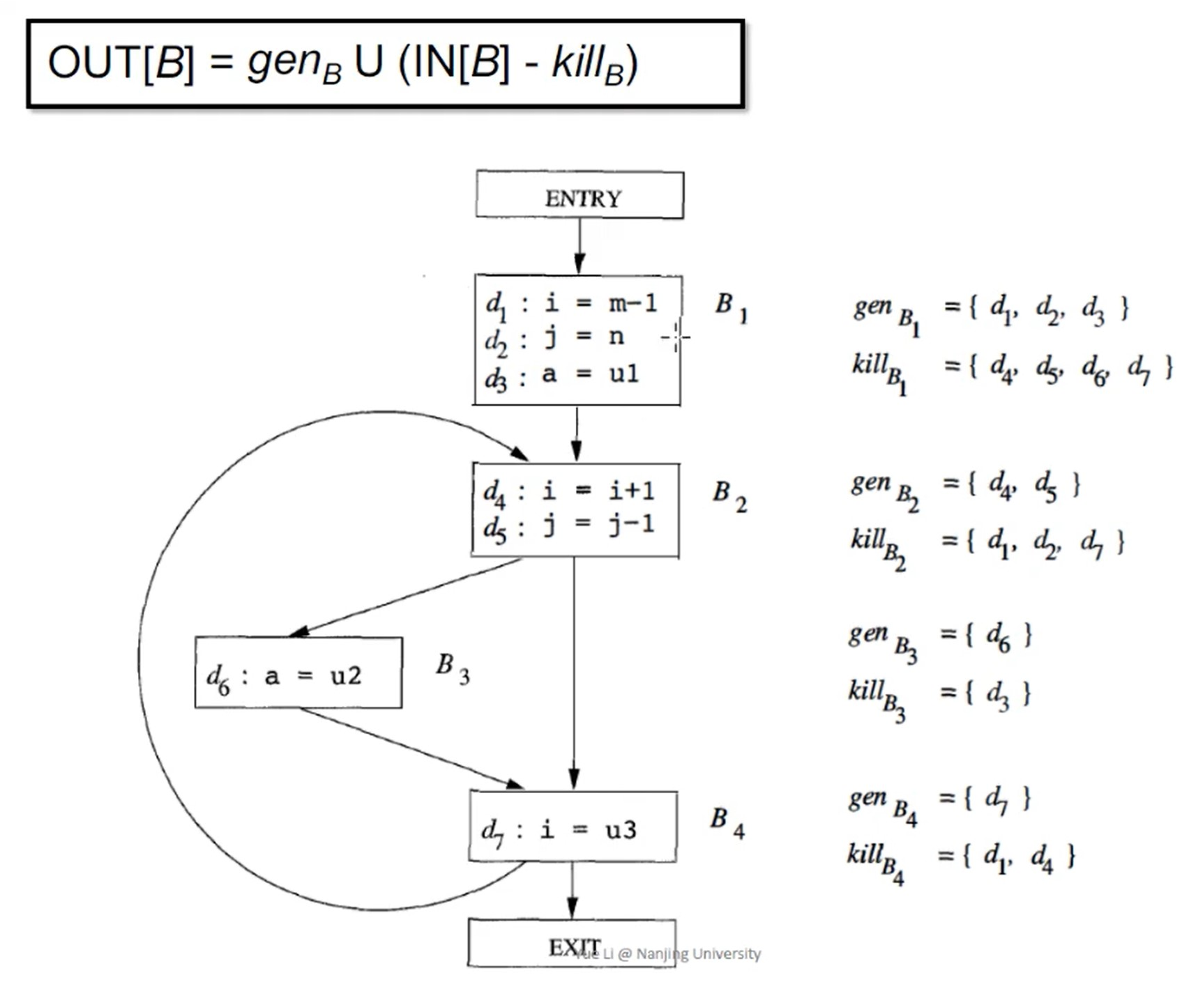 转移方程:$OUT[B] = gen_B\cup(IN[B]-kill_B)$
