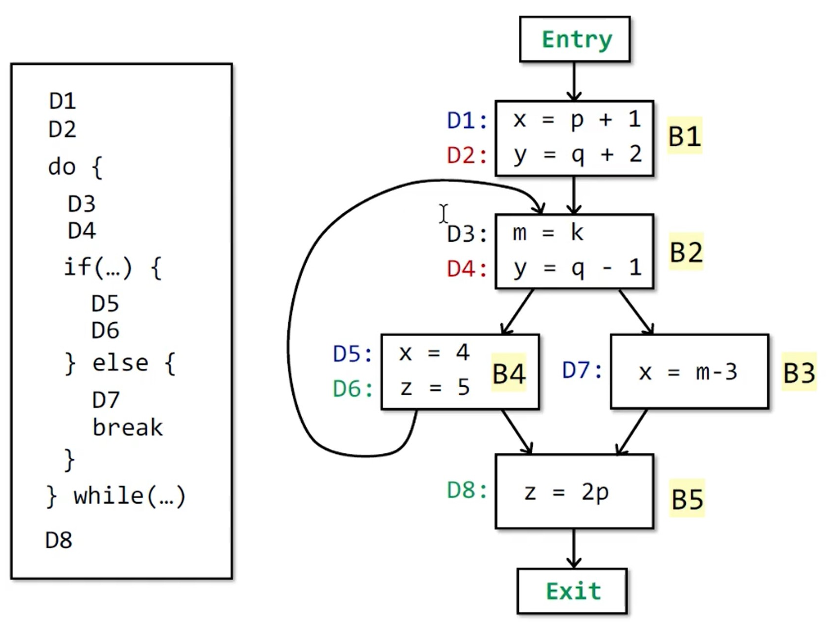 假定 x 有定值 d (definition),如果存在一个路径,从紧随 d 的点到达某点 p,并且此路径上面没有 x 的其他定值点,则称 x 的定值 d 到达 (reaching) p。(赋值的作用域?)